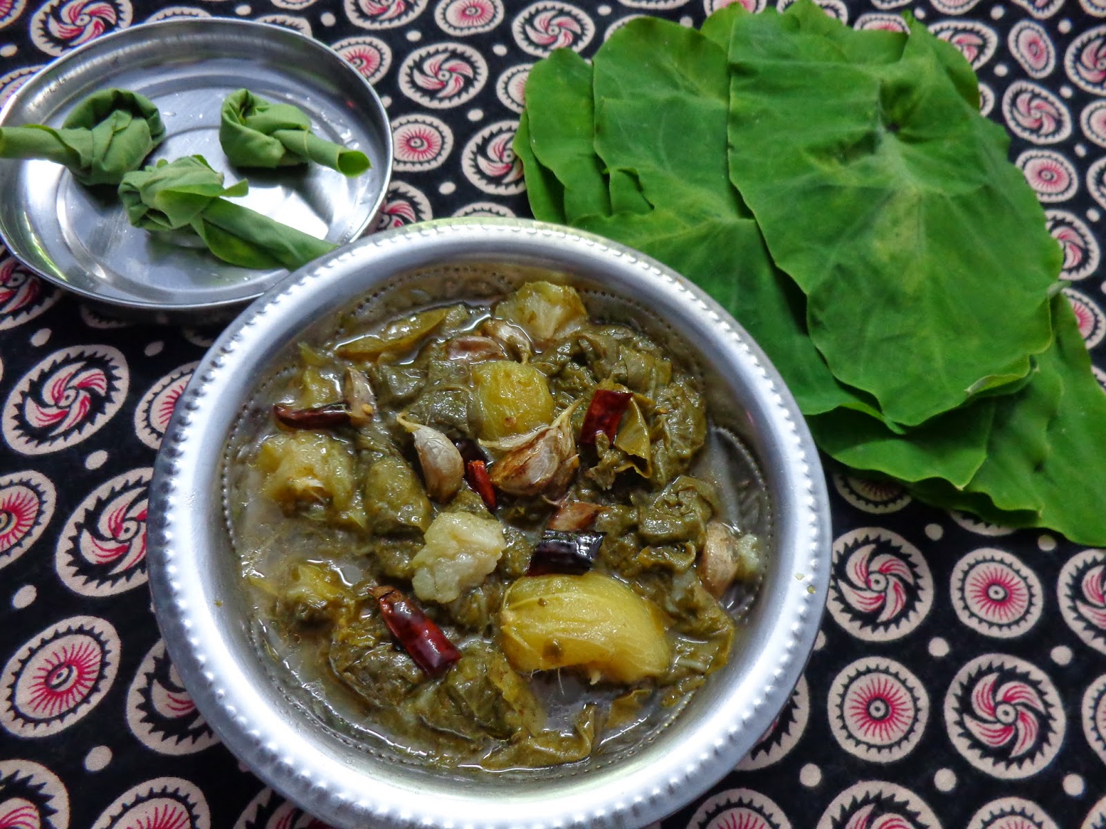 - Now add the dry chillies broken into halves and fry for a minute,then add the knotted arbi leaves in it and a cup of water,add tamarind juice.