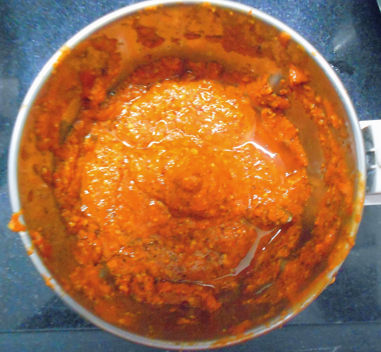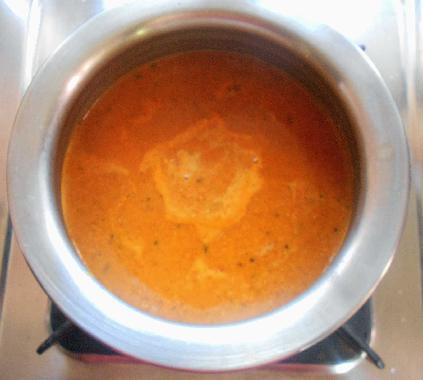 7. In a kadai ., heat oil & splutter mustard seeds  & curry leaves. then pour this paste into it adding a little more  water to your desired consistency  & salt to taste.  Remember that this will thicken when you add the fried mhav