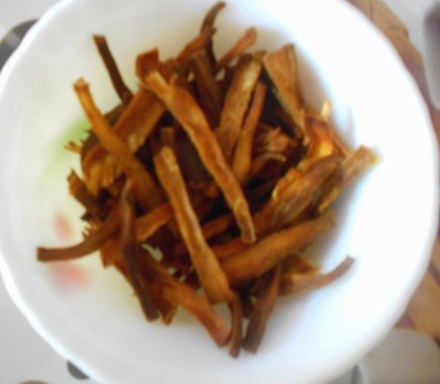 4. Add salt & keep for a while . Then squeeze out the water & deep fry them till crisp.  My son likes to eat them as such as a snack …hahahha so have to save some for the edigai !!