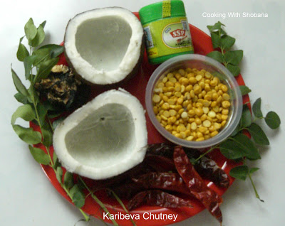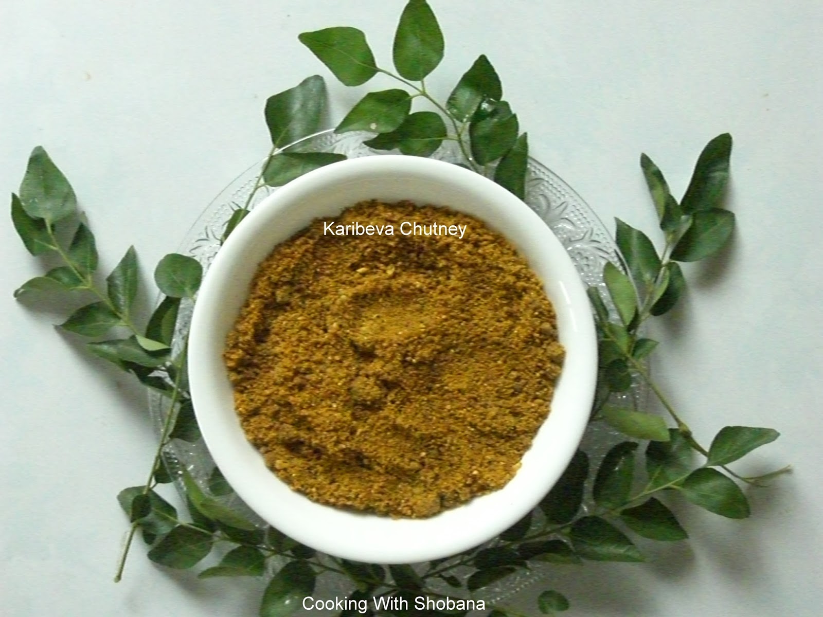 This is a simple chutney made of Karibevu, which is my mother tongue Konkani is what we call the aromatic “curry leaves”, known as “Karubevana soppu” in Kannada, “Karivepille” in Tamil, and “Kari patta” in Hindi. This is an accompaniment with the main meal.