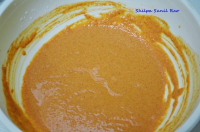 Mix rice powder, hing, chilli powder, salt, tamarind extract, rava and water to make a thick batter as shown in the picture below.