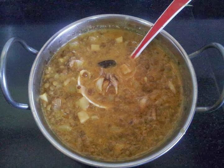 - Now add this ground masala to the cooked lentils, add salt to taste and boil vigorously till done (you will see a little dark colour in the middle of your boiling curry, which tells you that your curry is cooked).