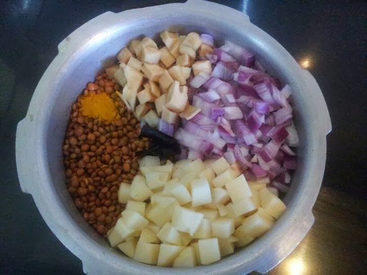 - The next day put the lentils, onion, potatoes and bamboo shoots in a cooker, add 1/4 tsp turmeric and 2 small pieces of dried bhrind sol.