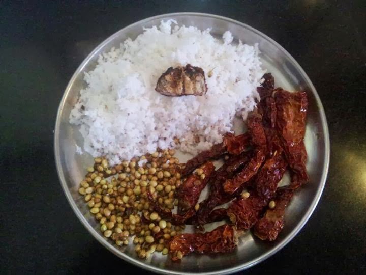 - In a pan put a few drops of oil and roast the chillies and coriander seeds till they give aroma.