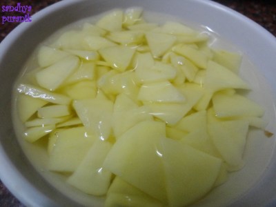 2. Peel the potatoes and slice them into thin triangles as shown in the picture and immerse them in water till use.