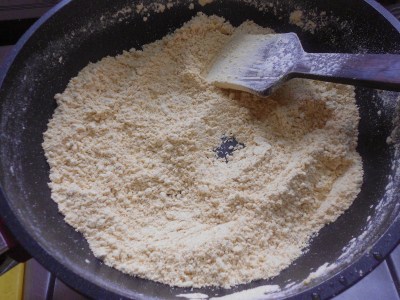 - Roast the besan without burning it till the besan starts giving a nice roasted smell & has slightly changed colour . Add the ghee so that you get this crumbly texture .