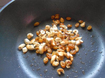 - Heat a little ghee in a thick- bottomed kadai or non-stick pan . Add the cashews first. When they are turning brown add the kishmish so that they fluff up . Remove & keep aside .