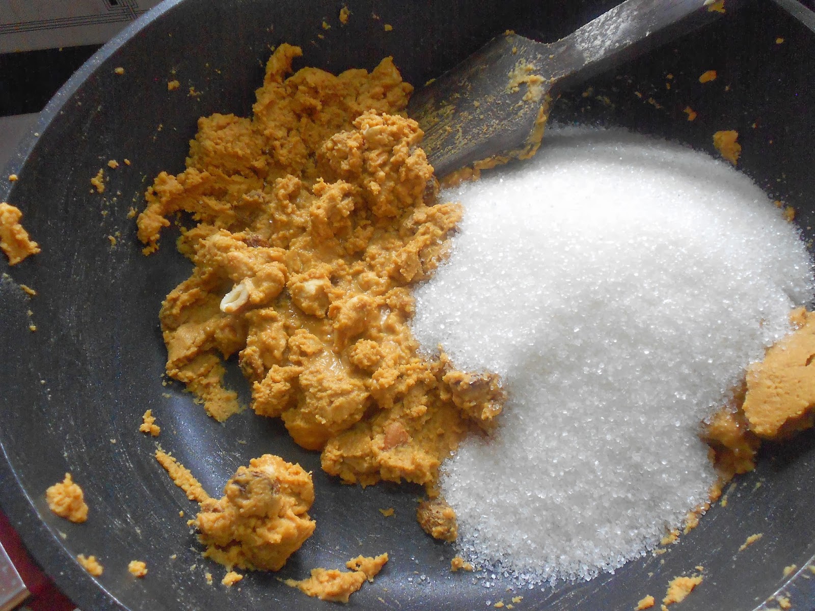 - After about 5 minutes add the cashews & sugar ( usually the sugar is powdered & added , but I like the bite of crunchiness in the oondo & so add it as such ), You can see that the mixture has become considerably oily than before
