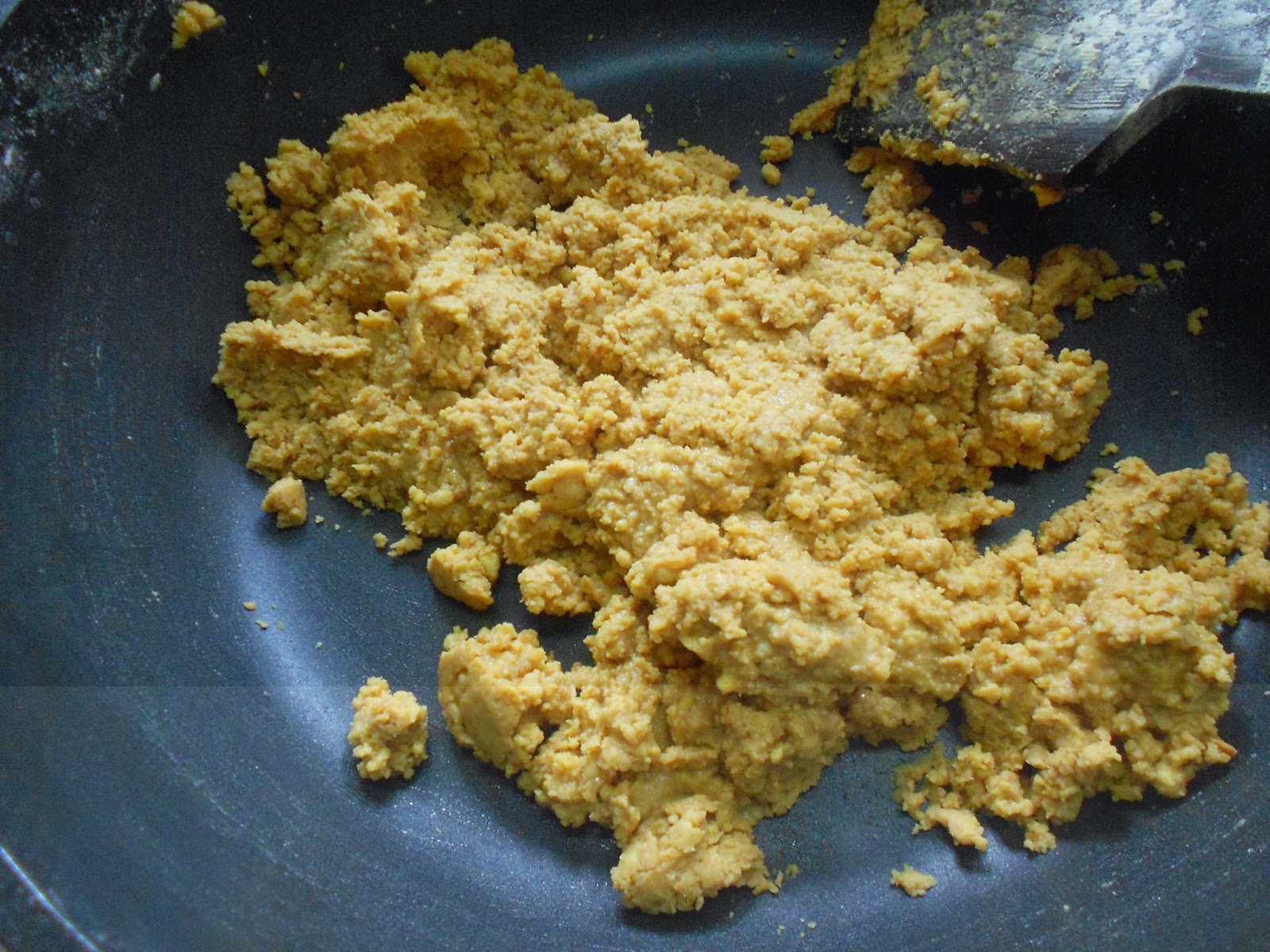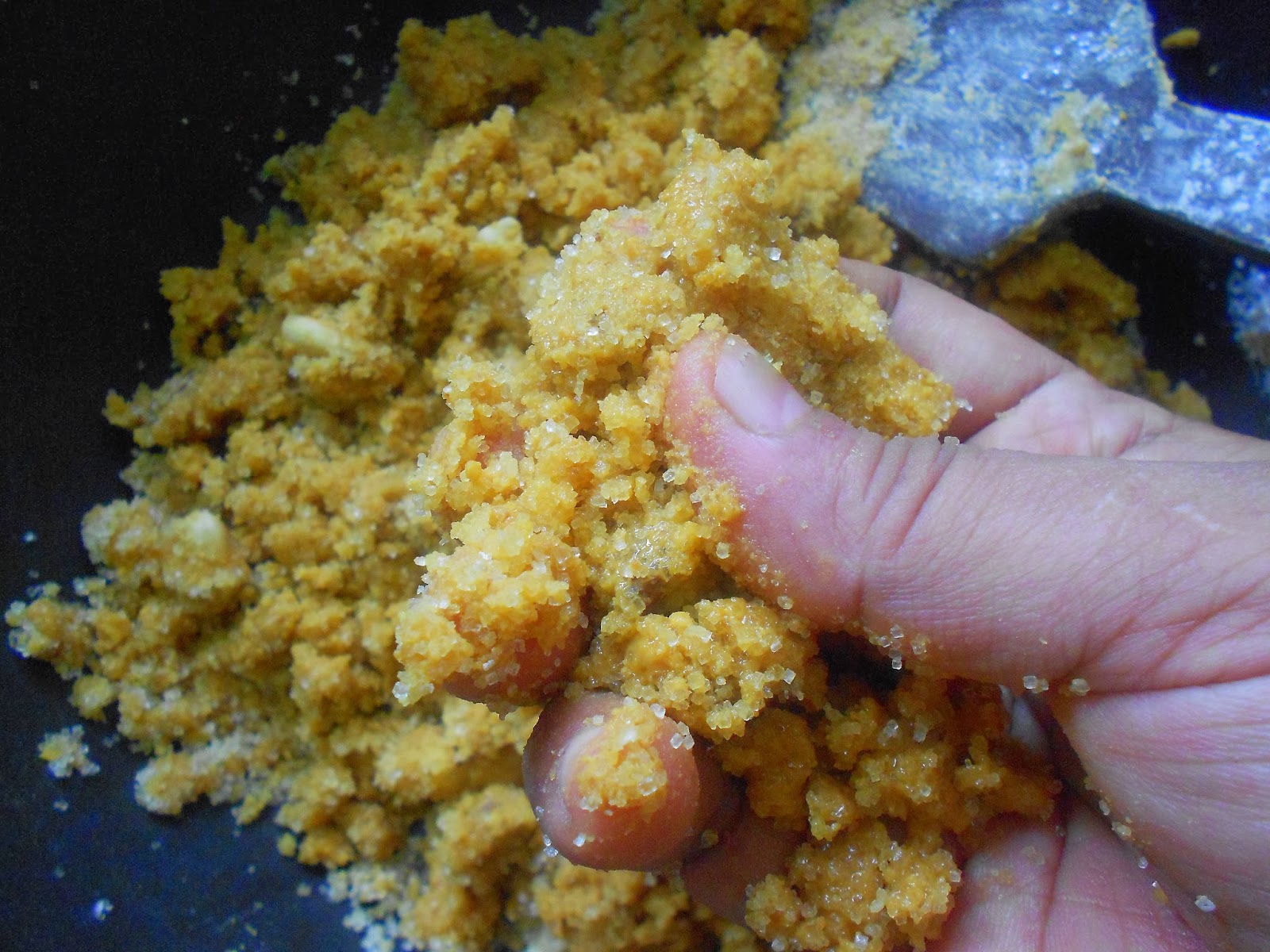 - Roast the besan without burning it till the besan starts giving a nice roasted smell & has slightly changed colour . Add the ghee so that you get this crumbly texture .