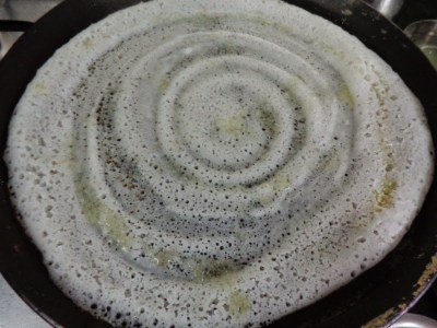 Step 1: Heat a tava/non-stick tava.Take a ladle full of dosa batter and spread the batter like u do for normal dosa and drizzle oil