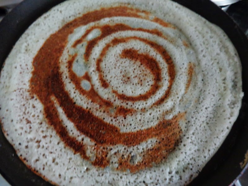 Step 1: Heat a tava/non-stick tava.Take a ladle full of dosa batter and spread the batter like u do for normal dosa and drizzle oil
