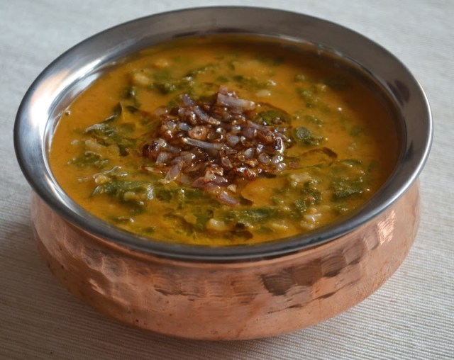 - Mix the cooked palak leaves with the boiled and mashed dal and add the ground coconut masol and bring it to a rolling boil.