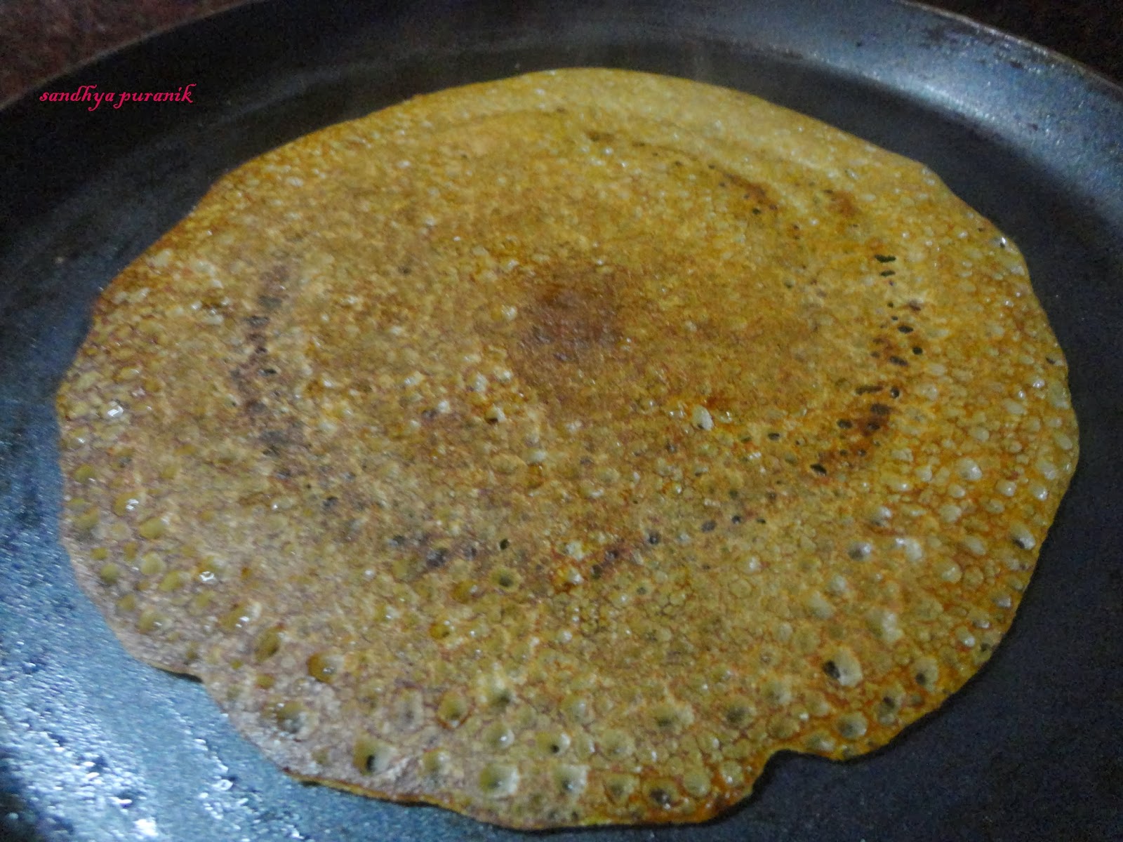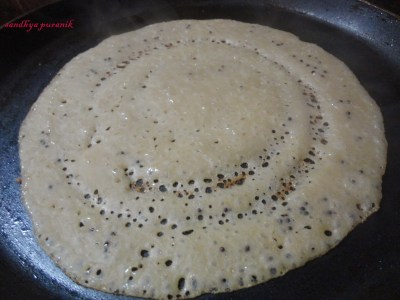 Flip it over to roast the other side also.The bottom side of the dosa would have turned golden as shown in the picture.