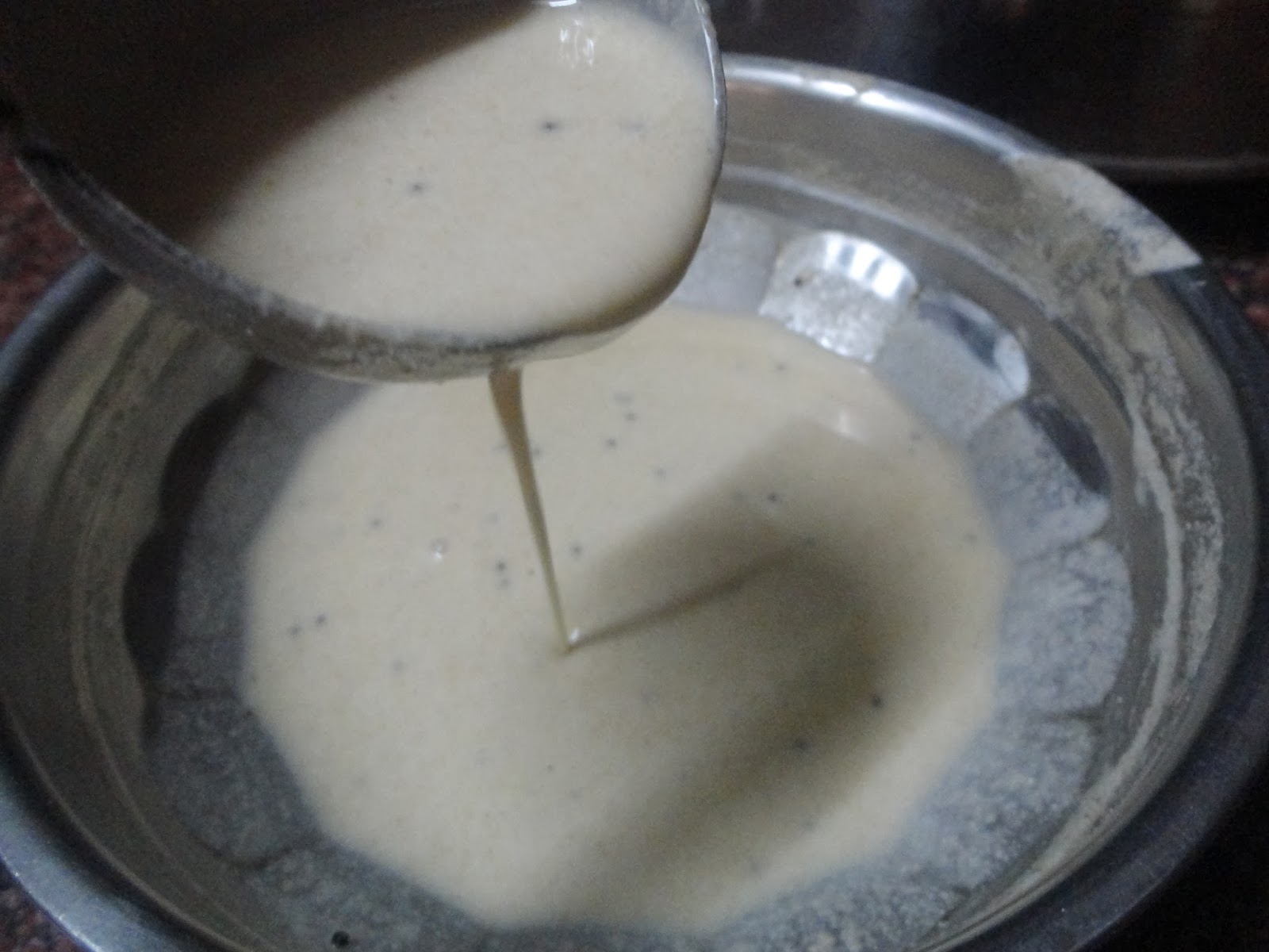 - Take the wheat flour in a bowl and add water to make a batter of medium consistency.It should neither be thick like idli batter nor watery and without lumps.
