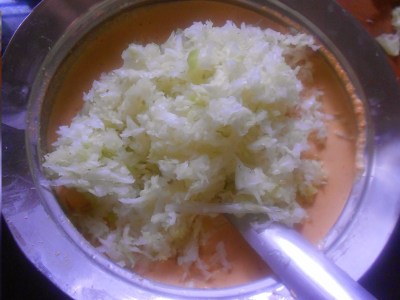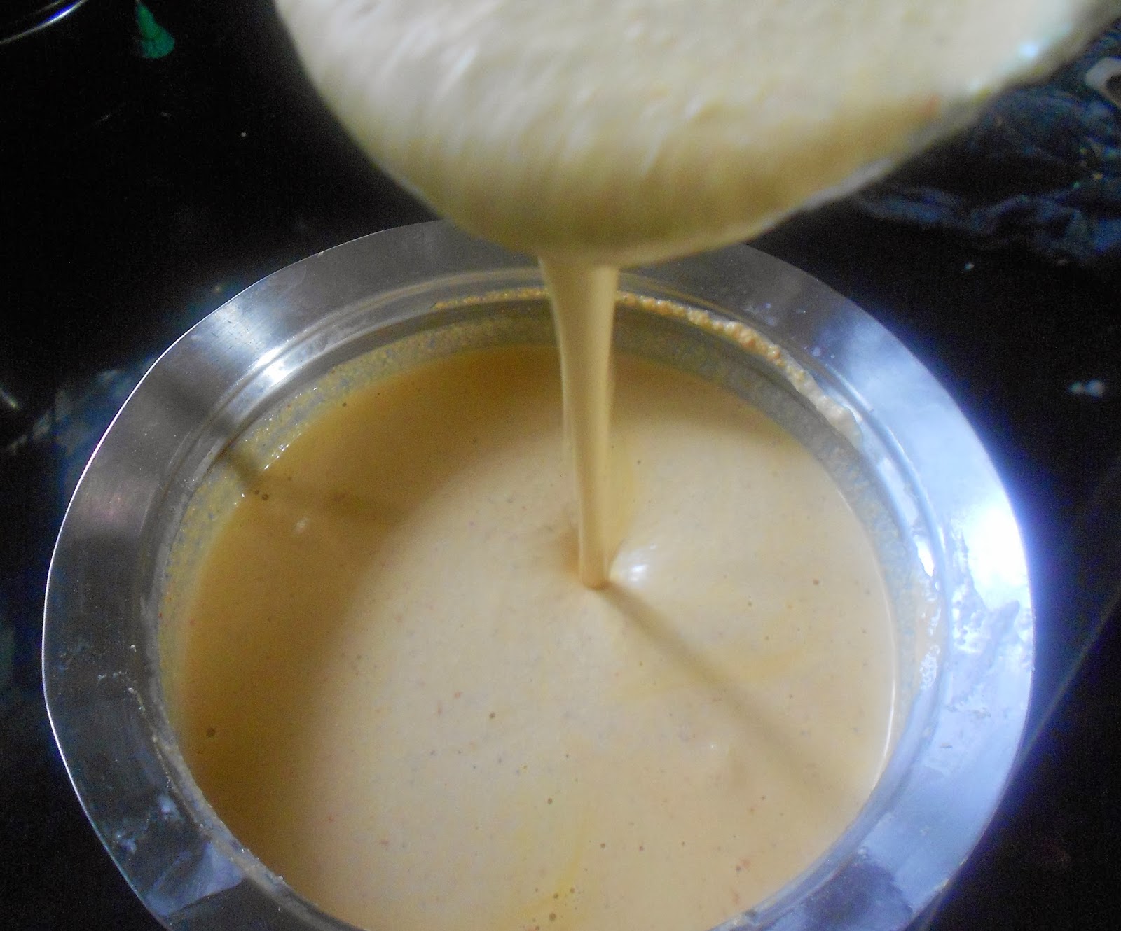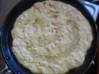 Mix well .Heat a tawa .&.spread a little oil – preferably coconut oil . Pour a big ladel ful of the batter & spread it out .