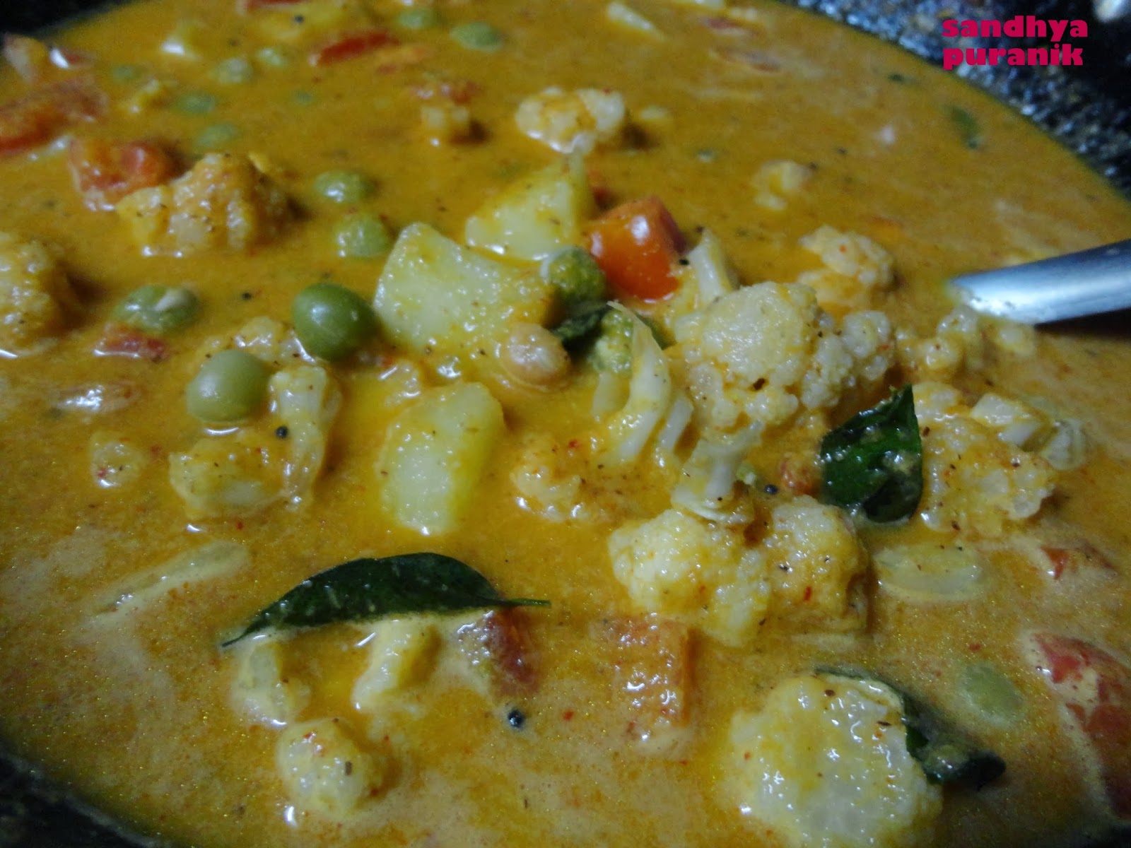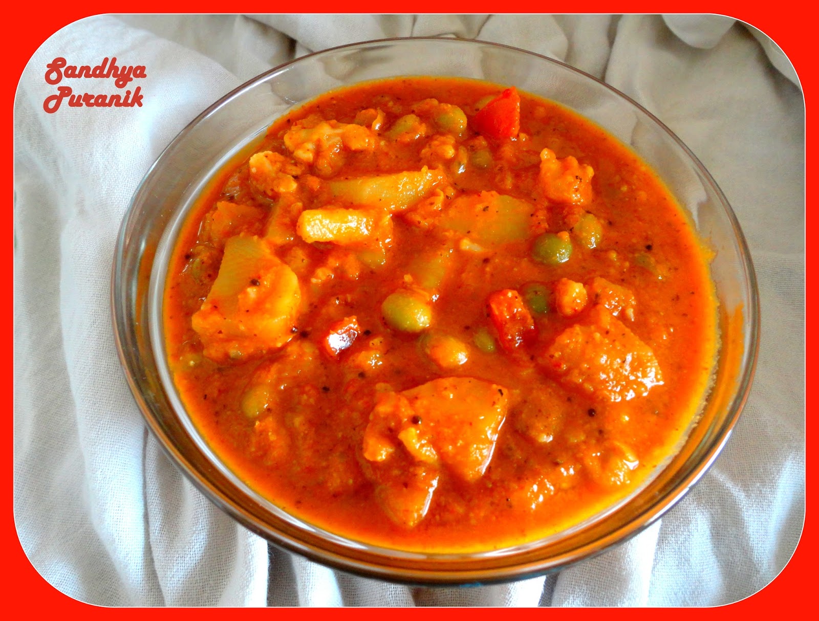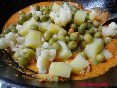 1. Pressure cook the green peas and potatoes for 3 whistles and cook the cauli -florets separately.