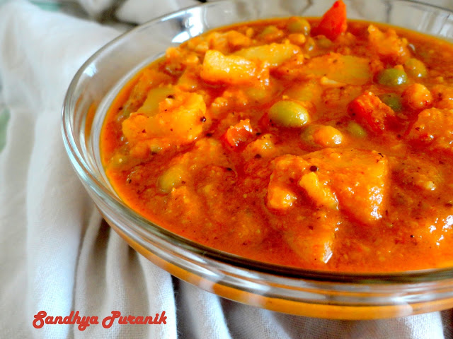 This truly is a new version for me since at weddings in Mangalore, batate vaghu is commonly prepared with only potatoes. Interesting change.