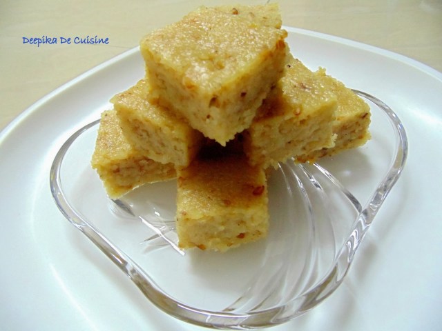 - Grease a tray with ghee & transfer the mixture into it.. When it is completely cooled, cut into desired shapes & serve.