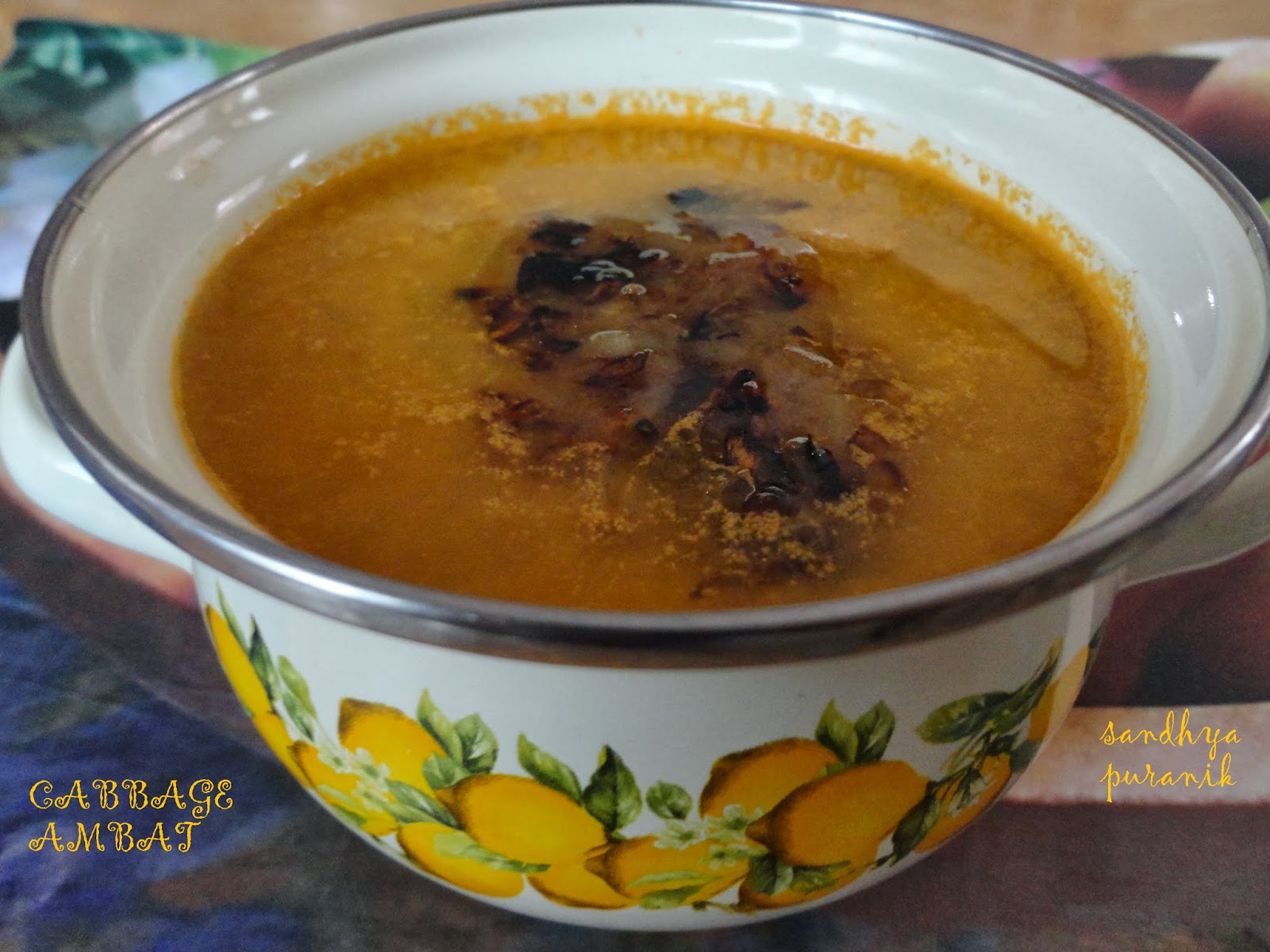 Ambat is a coconut based curry which is mainly used as an accompaniment to rice. Most of the Konkani curries are coconut based ones with the basic ingredients coconut,red chillies and tamarind / Bimbul / Karmbal to make the paste. What makes each dish different from other is the use of different vegetables and pulses and their combinations and the seasonings used . Ambat usually is prepared using tur dal and one vegetable combo but sometimes turdal is replaced by the coloured cucumber (magge in konkani) like Green Peas Ambat. Today I am sharing my recipe of Cabbage Ambat.
