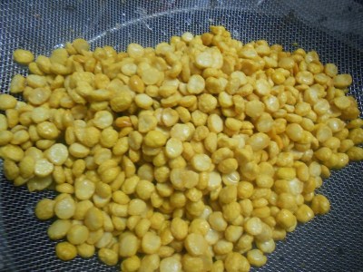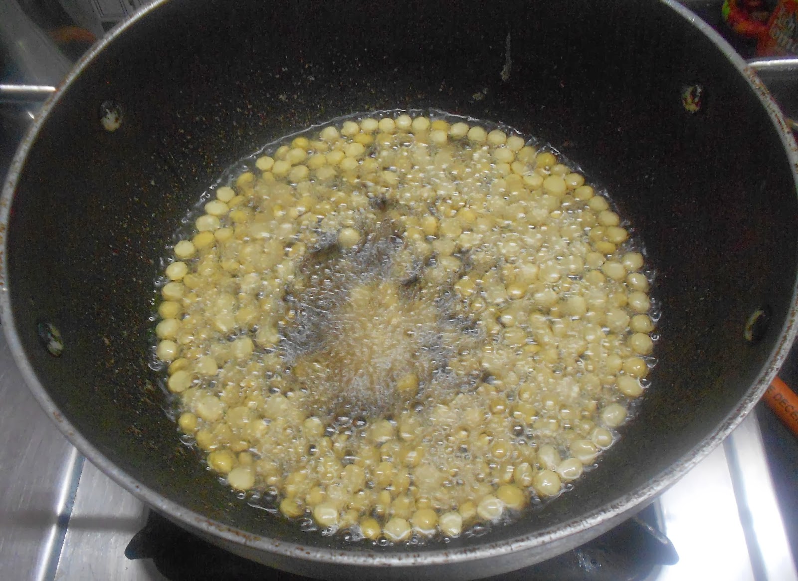 Next  deep fry the groundnuts . remove them in to a colander along with the chana dal.