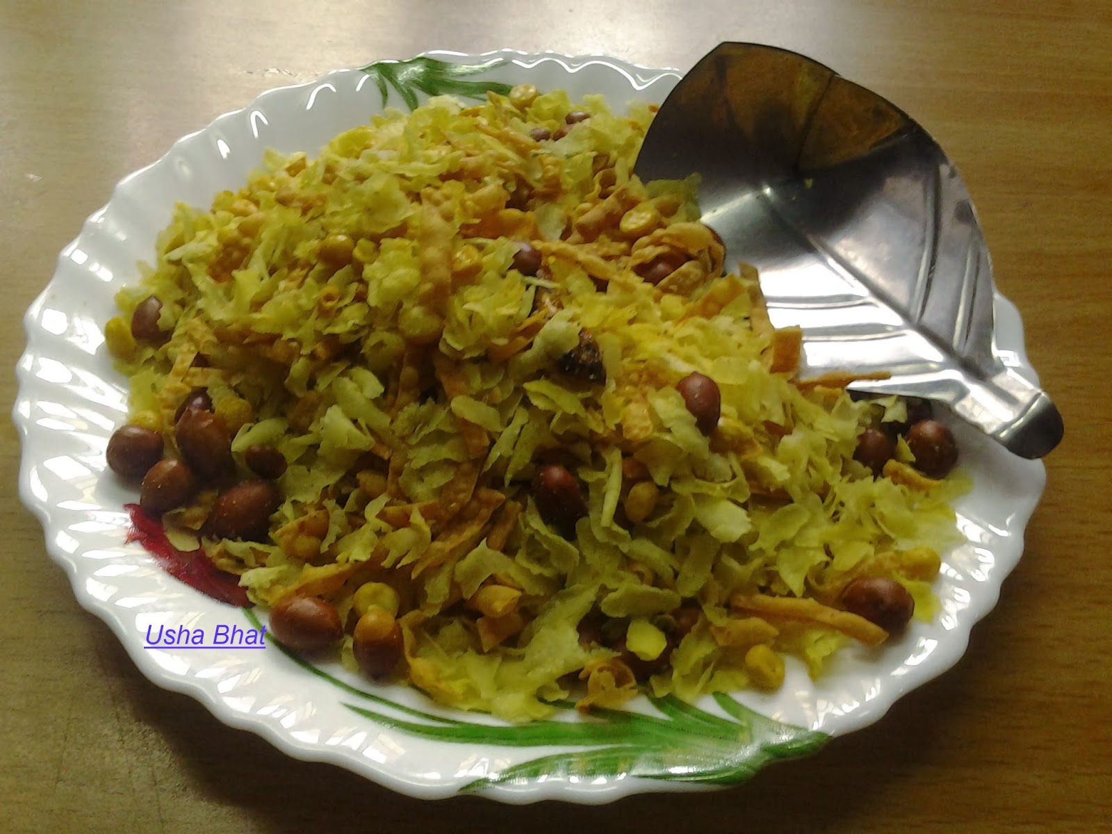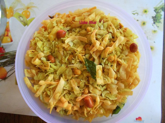 •  If you want –  you can also make sev & add too . Potato can be cut into thin strands ,fried & added too . Also dried green peas can be soaked , drained & deep fried  to add to this