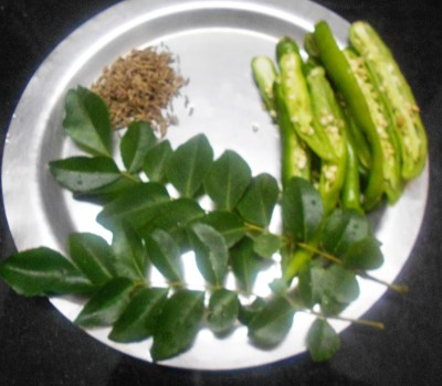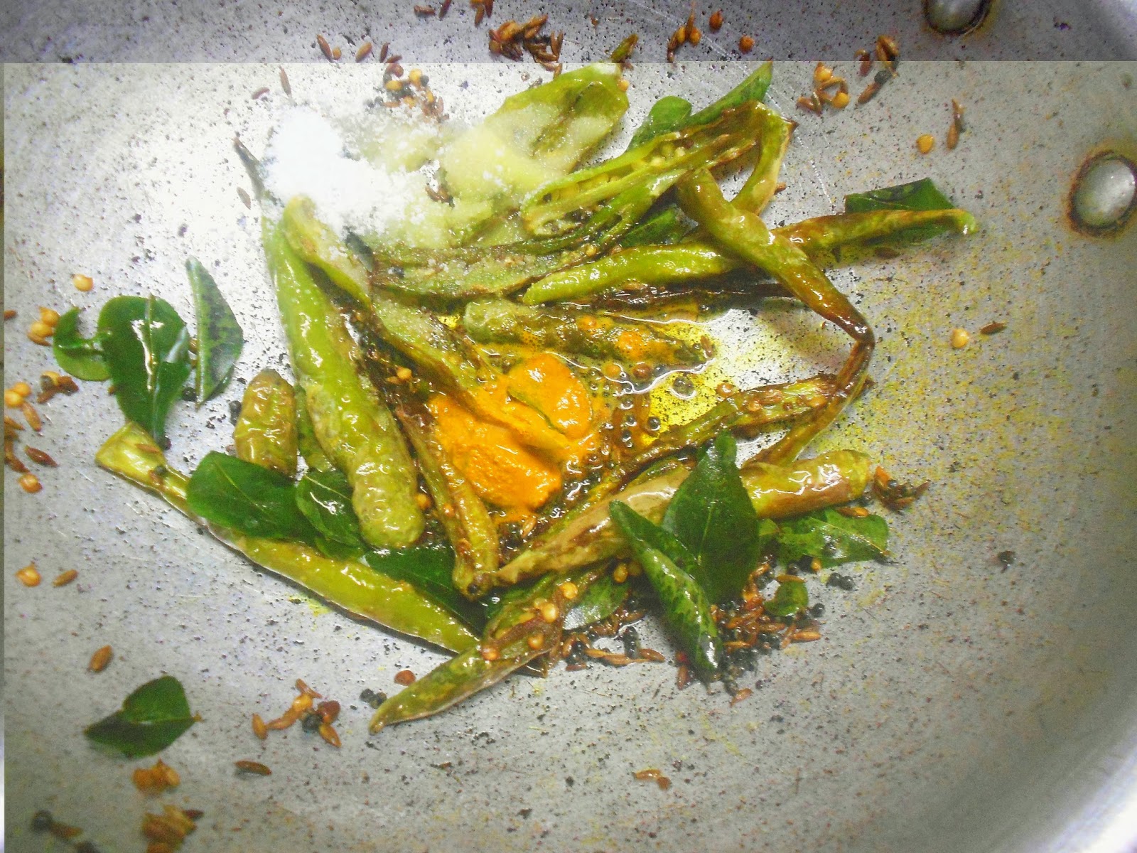 Slit the green chillies into two . Heat  about 3 tbsps of oil in a kadai .Add the mustard seeds