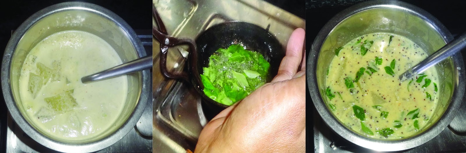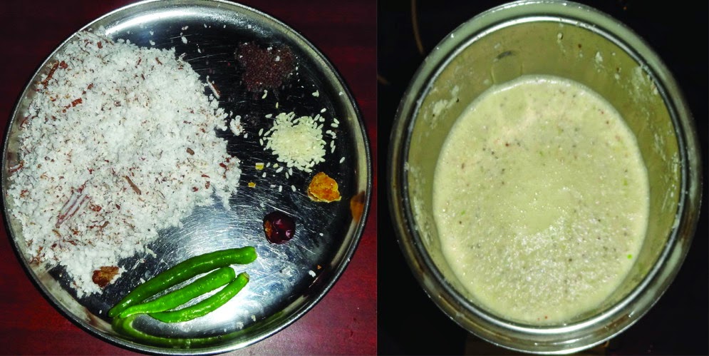 Grind a medium fine masala of coconut, red chilly, green chilly, mustard seeds, raw rice, jaggery and salt.