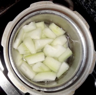 Peel and cut ash gourd into small pieces ( 1½”) removing seeds portion.