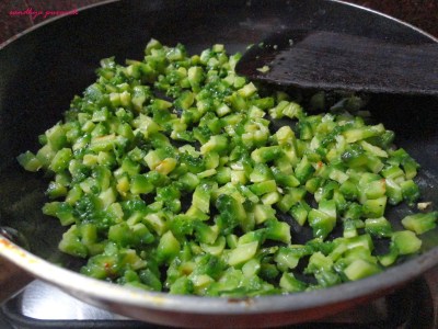 After 20 minutes ,squeeze the karathe pieces nicely to remove all the water,which will also reduce the bitterness and fry them on a non stick pan on low flame with few drops of oil like in the picture below….