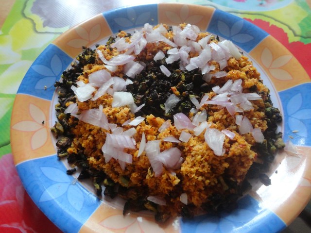 Once the  fried karathe is cooled,add the karathe pieces,chopped onions to the coconut mixture and mix well with hands so that everything blends well..