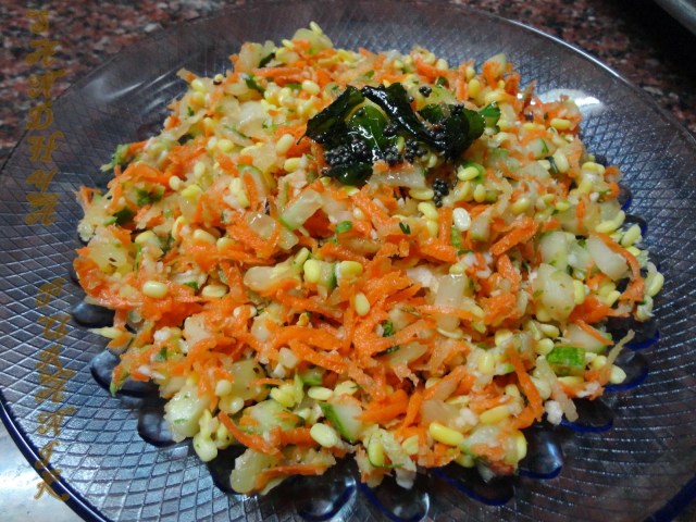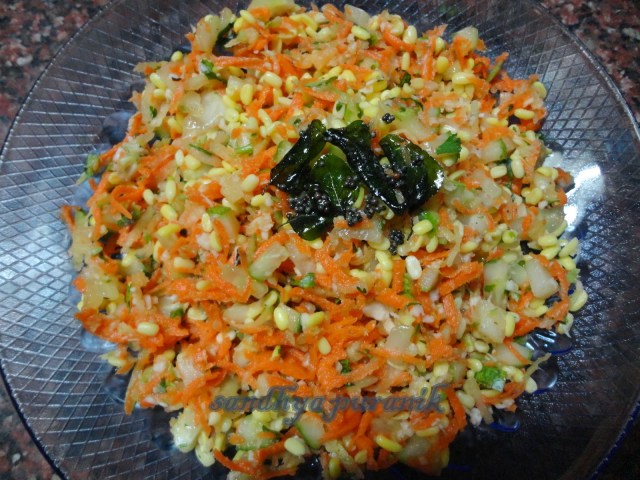 Kismuri is the Konkani word used for salads.I have already posted the Karathe(bittergourd) Kismuri and the Happala (papads) Kismuri which are mainly coconut based with onions .This recipe doesnt require too much of coconut and includes carrots and other veggies which makes it look colourful and favourite with the kids.This Kismuri is also prepared in temple during Teru(Rathotsava/Car Festival) in my native but without carrots and is a’ Sathvik’ dish.I add carrots to make it more colourful and healthy.You can also make this only with mungdal.