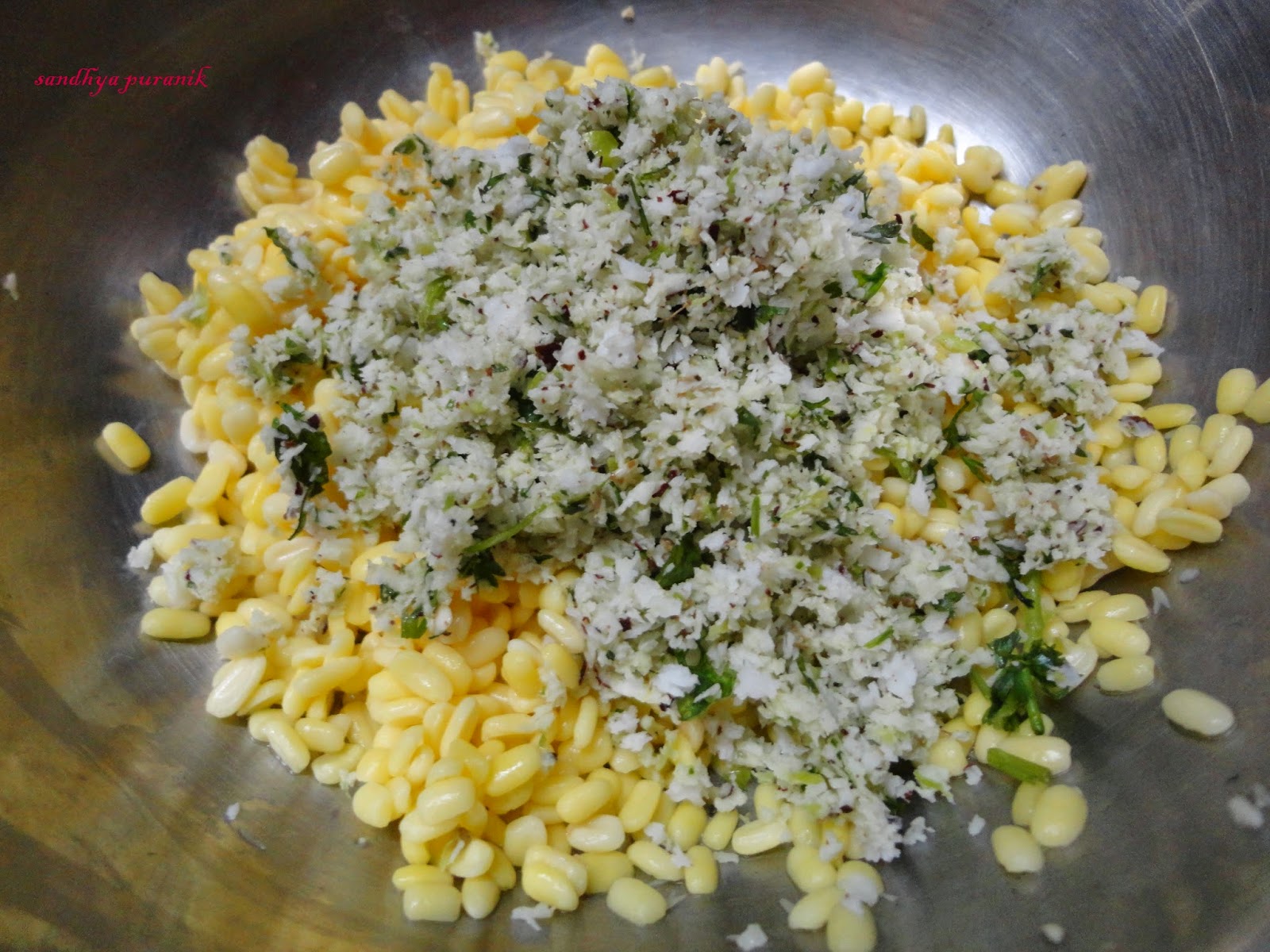 After 2 hours drain the water and wash the mung dal nicely and keep aside. Grind coconut, green chillies,hing ,coriander leaves with salt coarsely (just a round in mixer will do) without water and add to the mung dal.