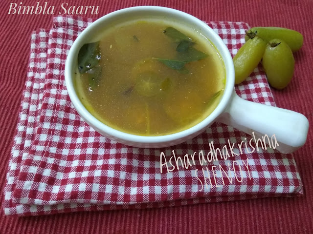 Are you searching for an easy yet tasty saaru recipe ? Here I am with such a yummilicious saaru/rasam to be had with rice.Bimbul is otherwise called Birmi karmbal/illimbeen puli/bimbili, etc in various languages.It is very good to lower cholesterol.Similar saaru can be prepared with tamarind or brined gooseberry in place of bimbul.