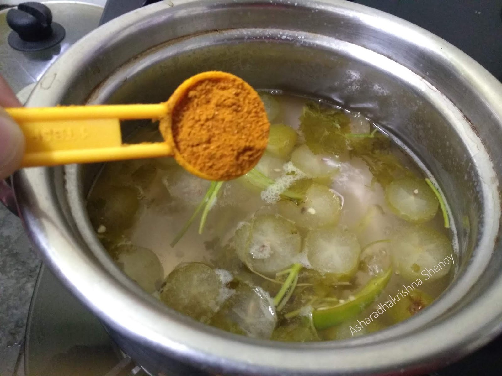 In a pan chop bimbul into round pieces,add slit green chilly,coriander leaves and water.Cook till the bimbul is soft.