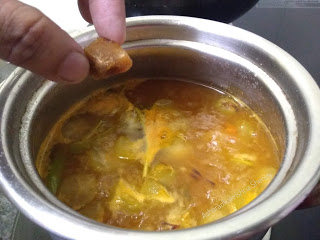Now add a tsp or 2 sambhar powder,a piece of jaggery and hing and bring to boil.
