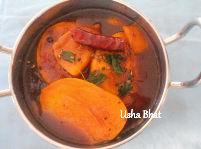 Summer means the arrival of mangoes & GSB s have so many dishes to enjoy ripe mangoes – truly called – the King of Fruits !! So the next time you get small ripe mangoes of the local variety .- dont think twice before attempting this lip-smacking Godda Ambya Humman! ,,This is such an easy & tasty recipe with a variety of flavours given by the sweetness of mangoes , the seasoning & the spiciness of the hero of this dish being – freshly crushed black Pepper!! altogether this gives a heavenly aroma ..So just try it out!!