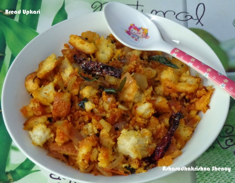 Are you bored with the routine bread sandwich and toast,then here is our own amchi bread upkari for you all.This is a very tasty and delicious breakfast/evening snack which can be prepared within minutes.This is very popular among Mangalore side GSBs !This can be prepared with leftover bread too and I am sure that everyone would love this including the kids and elders at home.Here is my version of bread upkari.
