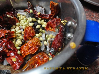 Mean while grind coconut,red chillies, tamarind and coriander seeds to not so fine paste using as little water as possible.