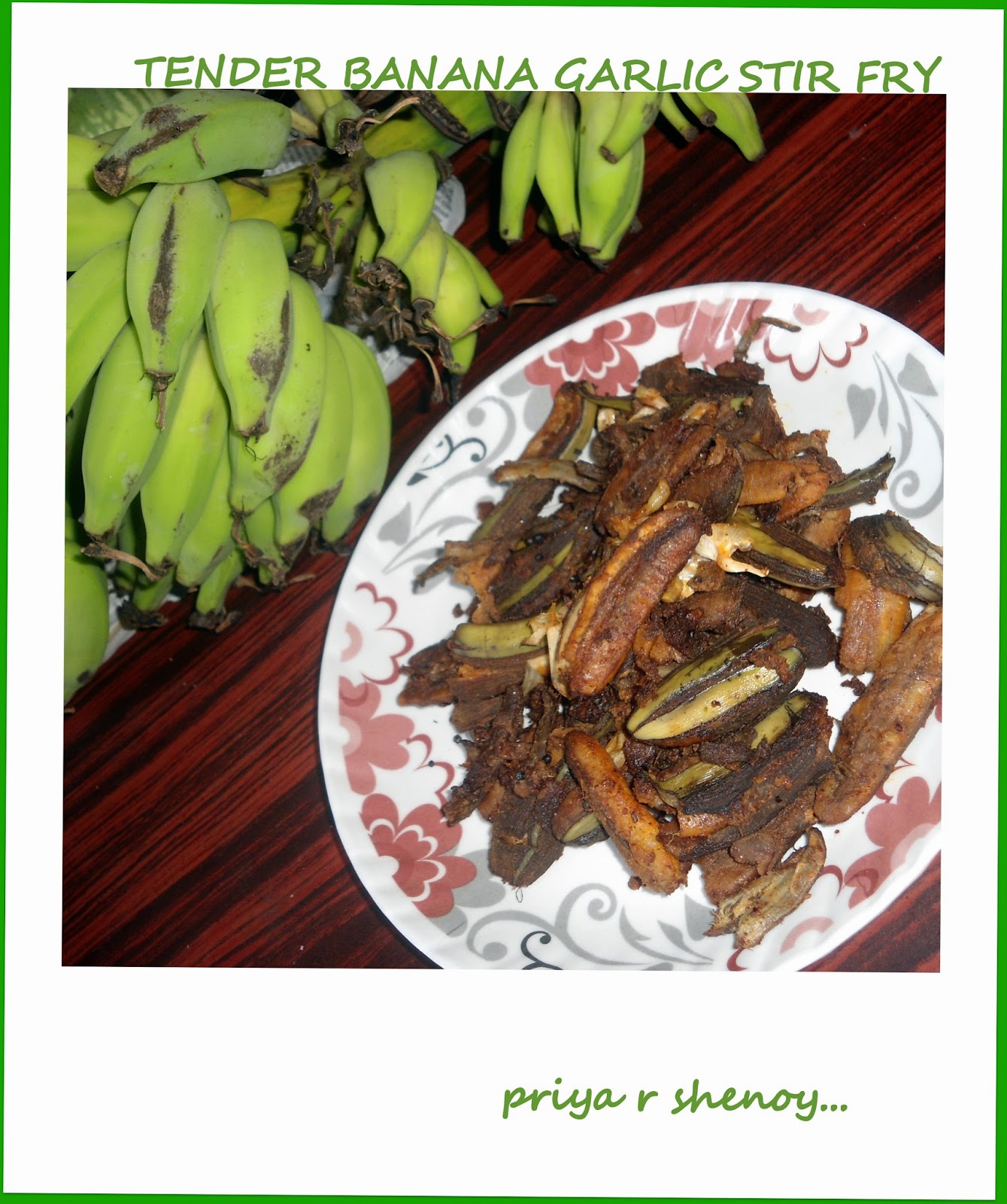 One of my favourite stir fries ….. usually prepared during rainy season when you get as many tender bananas as there is a chance of the plantains getting uprooted during heavy rainfall….So my Bappamma who does not waste any single thing in her backyard prepares this and we used to simply love this stir fry. The speciality of this stir fry (upkari) is that you dont chop the raw bananas ,,as they would be too tender and small …you need to remove the skin and crush them a little as you do for thendle thalasini ….keeping a little skin intact (so that the banana wont get cut in to pieces while you crush them ) ….Interestingly this is also called as “ajji bhodko ” ( meaning grandmom’s head ) …..i don’t know what connection this has got with poor grandmoms but surely some interesting story would be behind it…..