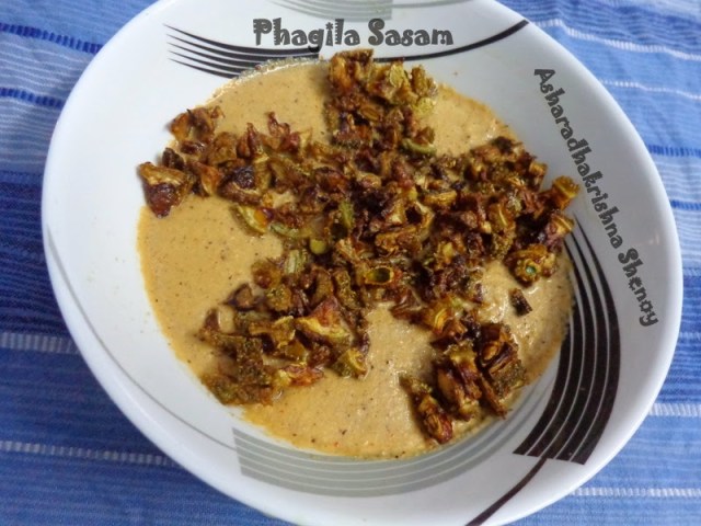 Phagil means teasel gourd/kantola.It is a seasonal vegetable.Sasam means mustard.This curry is a side dish with semi gravy consistency.The gravy is based on coconut and here we use mustard while grinding the masala . Phagil is deep fried and added to the masala.Here the Masala is raw and not boiled/cooked for this particular sidedish.