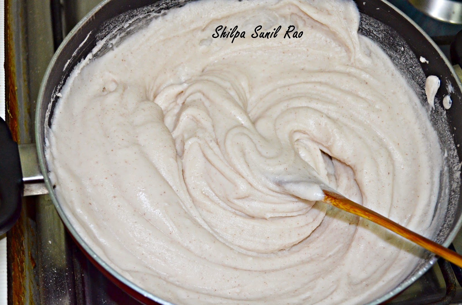 - Collect the smooth paste in nonstick pan also add a glass of water which is used for washing the grinder.. Mix well and keep on low flame over gas.