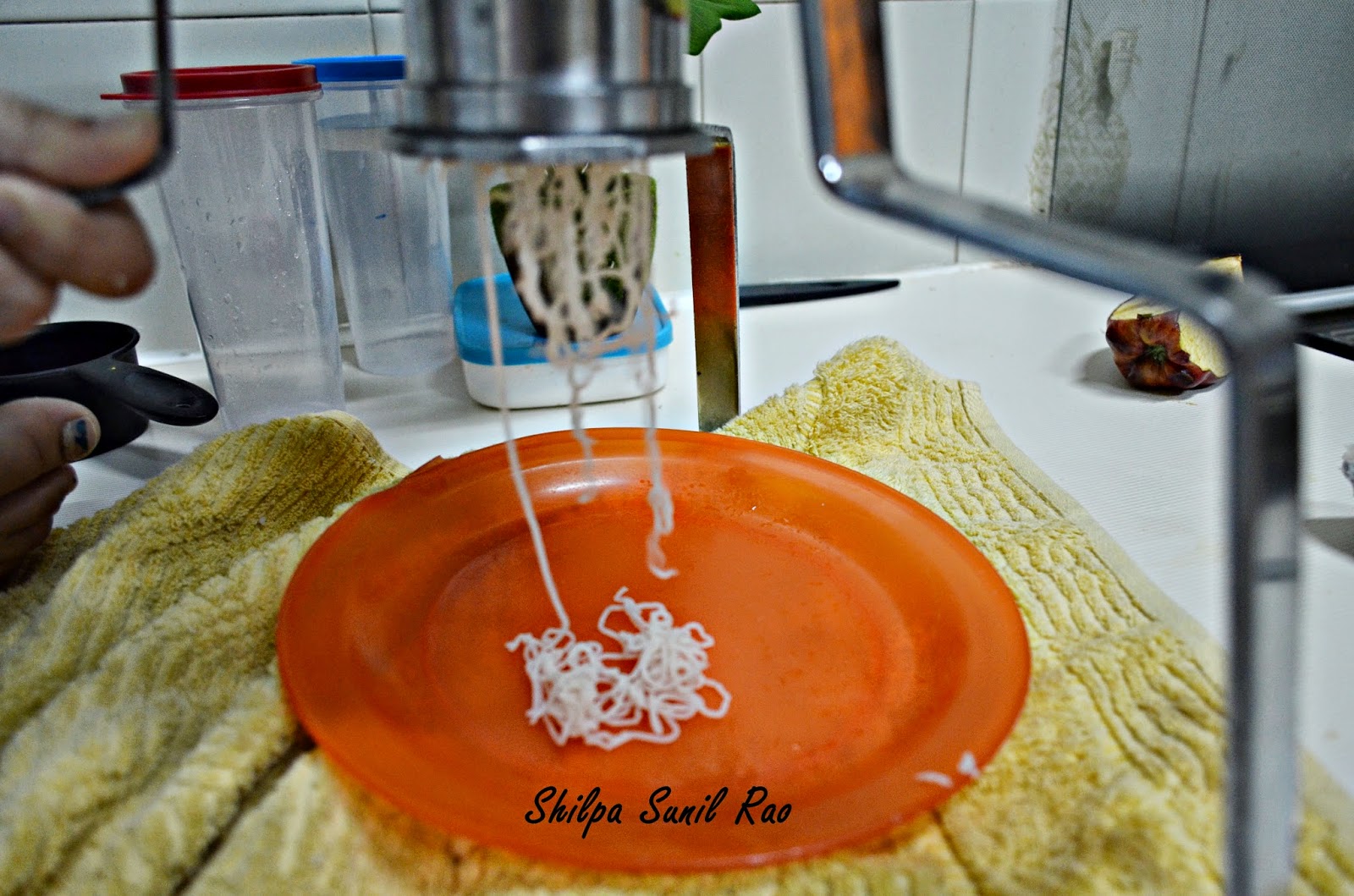 - Now grease shevai maker with coconut oil. You can use any oil . If using handheldone – Cover the outer layer with cloth so that it doesn’t blister your palm/hand. I used a shevai maker with stand. When the pellets are hot with a spoon add one to the shevai maker and press immediately. Move the plate below to form a elongated shevai bhatti. Here you will require another person as one will insert the hot pellets the other can press. Also after you remove the steamed pellets from the steamer. Keep the remaining in the steamer closed at all times. If you find the pellets have gone cold. Steam it again for 5-7 mins till warm and press again. Please NOTE – cold pellets cannot be pressed and shevai will not be made.