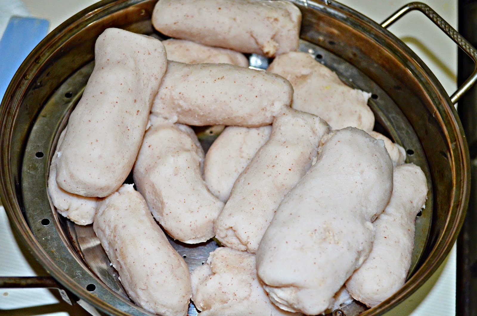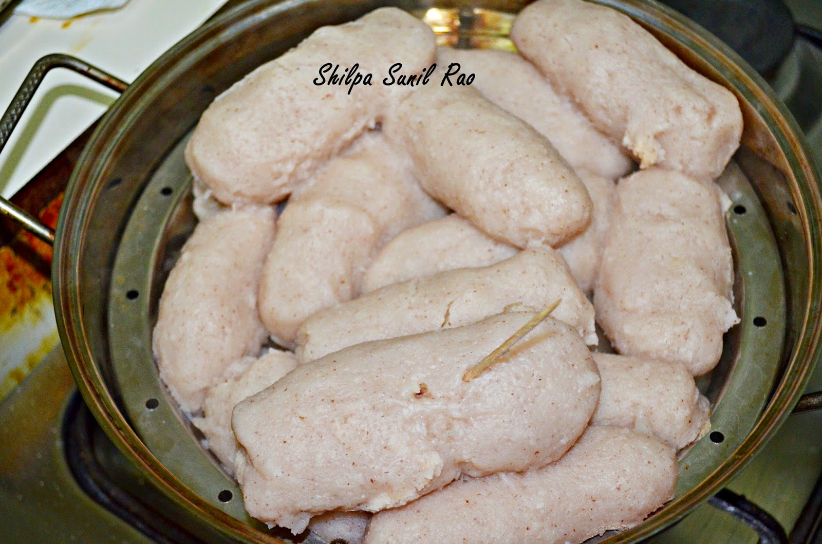 - When the dough is cool enough to handle, dip hand in cold water and make pellets like shown below. Keep it in a steamer with water below. Switch on the gas at this stage.