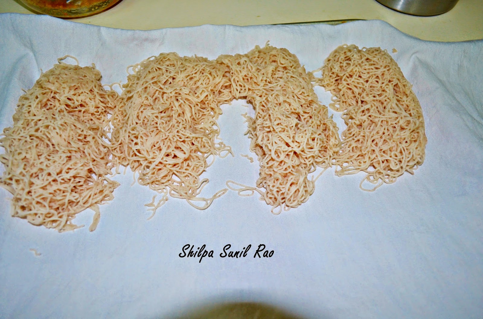 Shevai is a traditional food in many Amchi households. Shevai is made all over south India with different names. In Kannada its called Shavige or Shamige In Malayalam & In Tamil its idyappam,. In Tulu ( A local dialect of South Karnataka region spanning from Udupi to Mangalore ) its called Noo Kadde. There is an interesting story behind it. In olden times whenever guest overstayed and you wanted them to leave the host of the house used to prepare Shevai or Noo Kadde which was an indication for the guest to leave 😉 . So next time Shevai is served to you – get the hint 😉