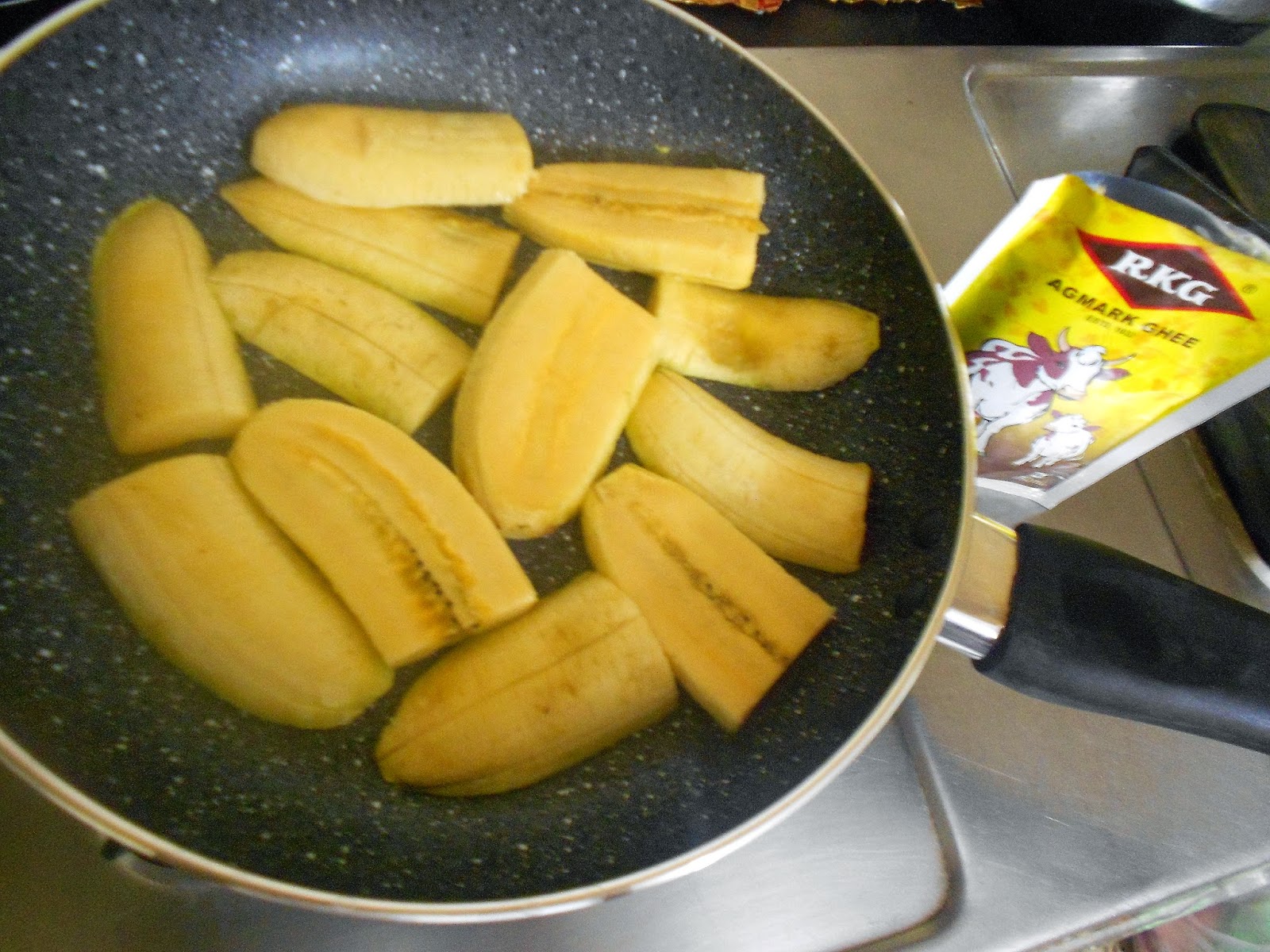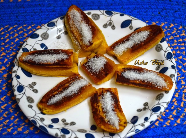 When I as a kid returned from school- hungry & tired – a nutritious snack would be waiting for me . Its aroma would fill the house and we would run to wash and change so that we would be able to eat the delicacy – and that is – the Nenderbale kele bhajjille . Ripe or even over ripe nenderbale kelas would be tawa fried with oodles of ghee & topped with sugar . Which kid can refuse to eat this ?? So try out this as an evening snack or anytime snack !! Even kids can do this by themselves with adult supervision!
