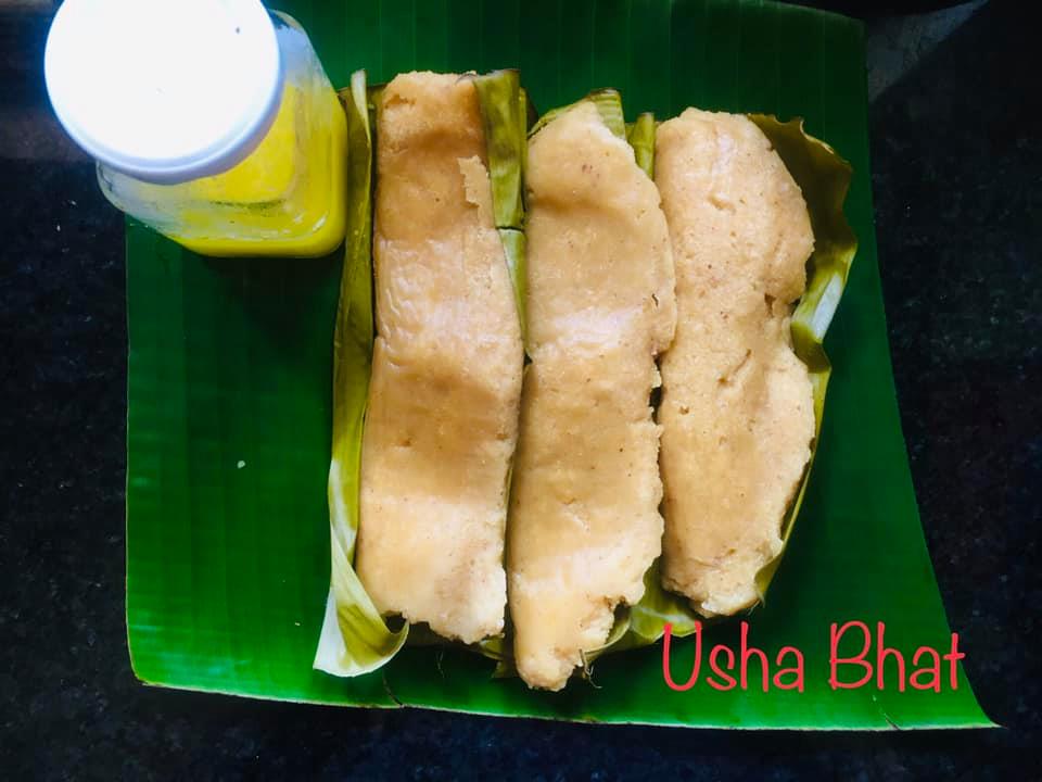 Note :- You may also make stuffed pattolis … grind only the rice to a smooth thick paste adding a pinch of salt (optional) . Mix Ingredients – 2 , 3 & 4 well . Spread the rice batter with your hands tapping gently ( tappoche ) on the banana leaf in a small circle . Place the stuffing or puran in the centre . Fold the leaf & steam. You can also use finely powdered rice flour too …Add hot water to the flour in a bowl , Mix well with a spoon and then make a thick batter adding some more water if needed . You can also cure the banana leaves before using it – Curing means holding the leaf on a flame for a few seconds so that it becomes soft .