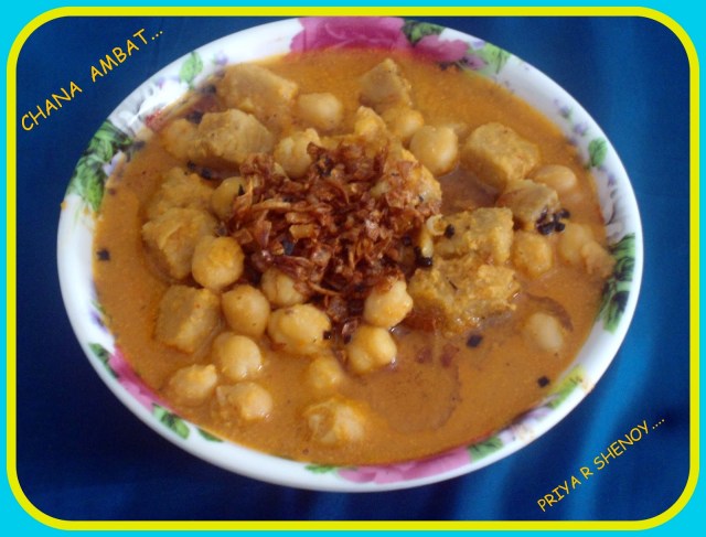 ” Chana ambat ” is a simple mild curry prepared from either black chana or with the kabuli chana. It can be served as a main course curry with rice. Along with chana you can also add yam (surnu ) or yellow cucumber in the ambat .