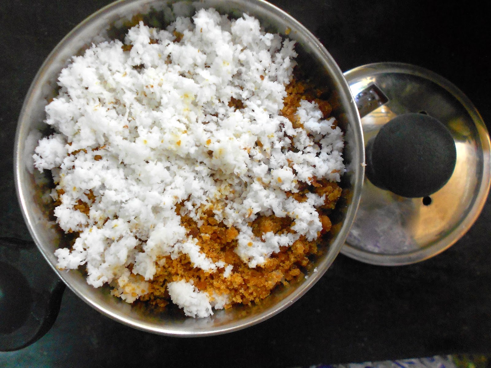 - Now add the jaggery & grated coconut separately in layers or as a mixture!