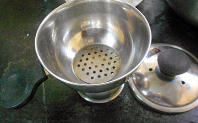 - When the water is boiling place the poot steamer on the whistle nozzle of the cooker like this !