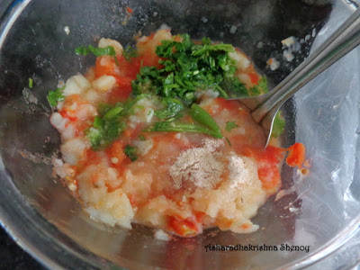 Crush Green chillies and salt together.Add this to the potato tomato.Put hing over it and few coriander leaves and smash well with your hands.